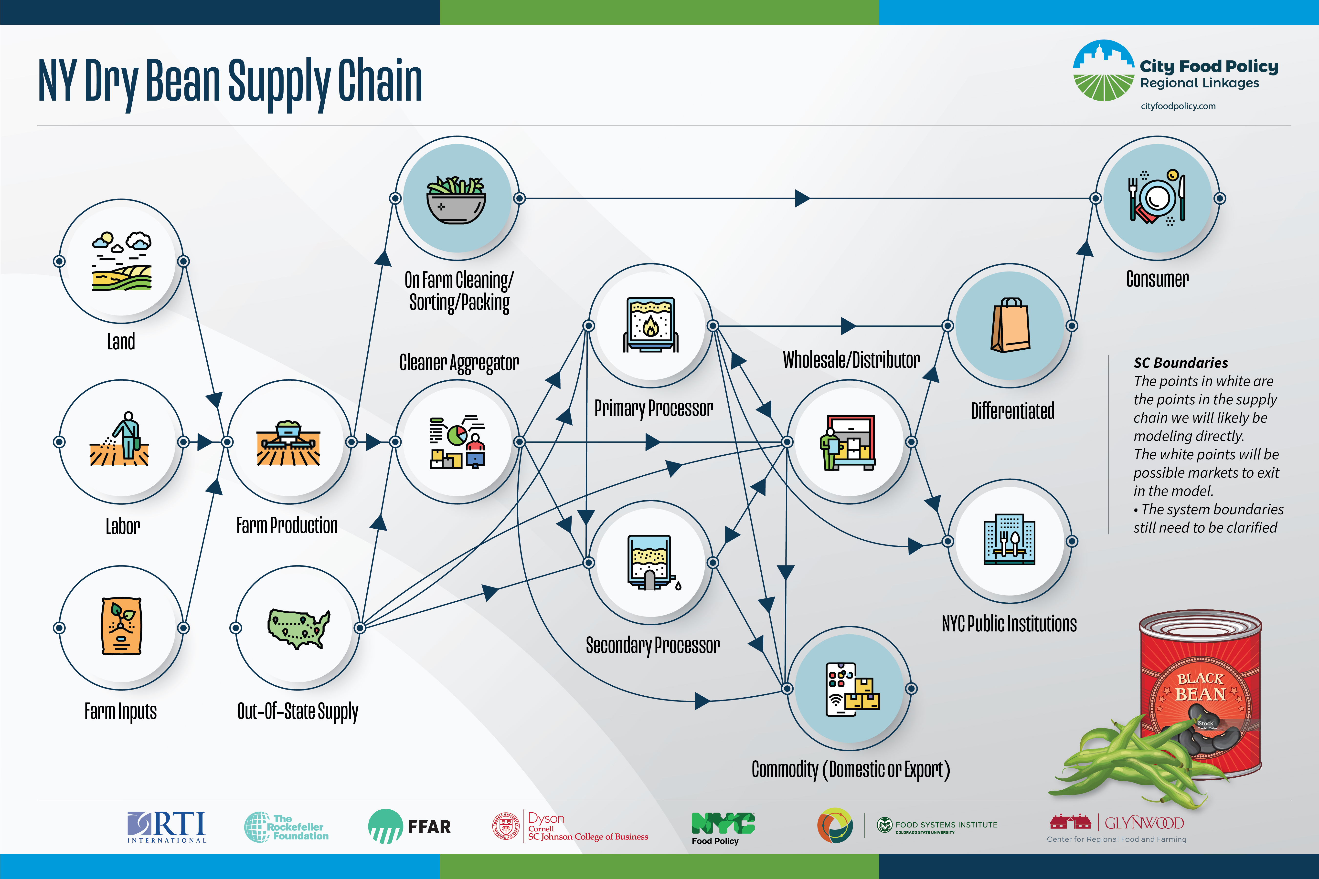 In the model, each “agent” represents a type of food system participant—such as farms, food businesses, or City agencies—with distinct roles, constraints, decision rules, and characteristics. We refer to these as supply chain stakeholders, each of which has different types of characteristics. For example, a farm can have one or more of the following characteristics: small, certified organic, M/WBE operators.